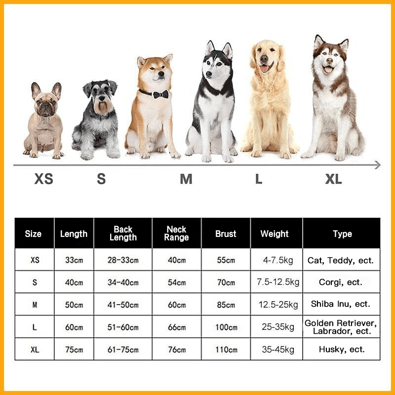 Disponível em 5 tamanhos, do XS ao GG, serve para cães e gatos de pequeno, médio e grande porte. O peito e o pescoço arredondados são ajustáveis para cobrir melhor o corpo do animal.